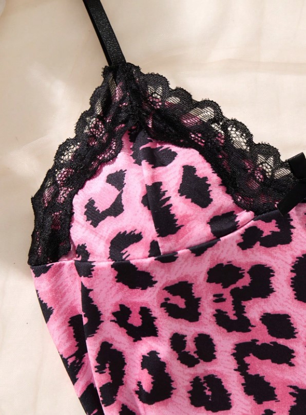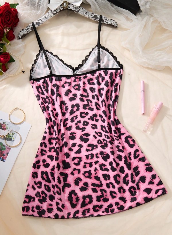 Despierta tu lado más atrevido con este camisón rosa estampado de leopardo, realzado con delicado encaje negro en el escote y el dobladillo. Ideal para noches con estilo o momentos de glamour íntimo.