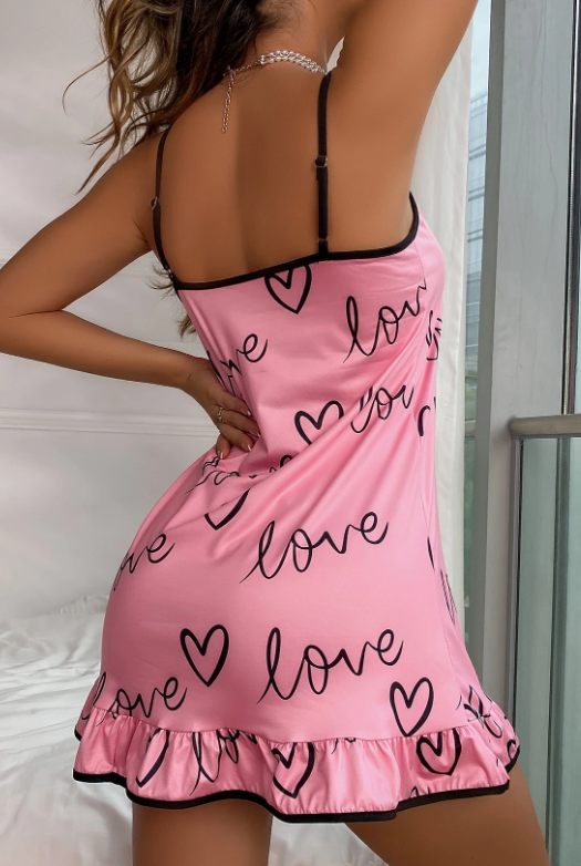 Despierta con estilo y ternura. Este camisón rosa con corazones negros y detalles celebra el amor propio con un toque juguetón. Su caída suave y el volante en el dobladillo lo hacen perfecto para noches cómodas y mañanas con actitud.