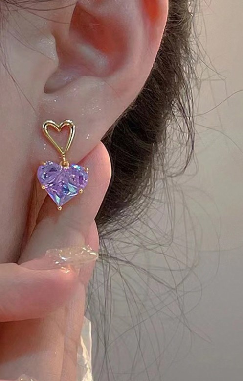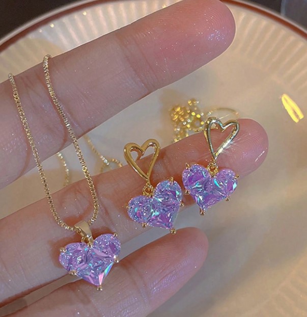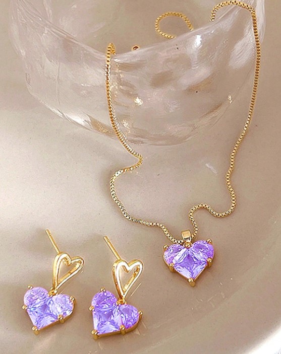 Set de collar, dije y aretes con gemas en forma de corazón, de brillo iridiscente púrpura y acabado dorado. Un toque romántico y sofisticado para cualquier ocasión.