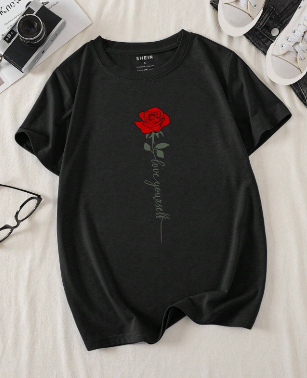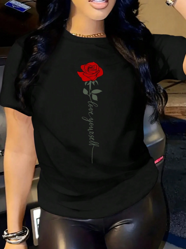 Expresa tu fuerza interior con esta playera negra de corte moderno, decorada con una rosa roja y el mensaje vertical “love yourself”. Perfecta para looks casuales con actitud, combinando moda y autoestima en una sola prenda.